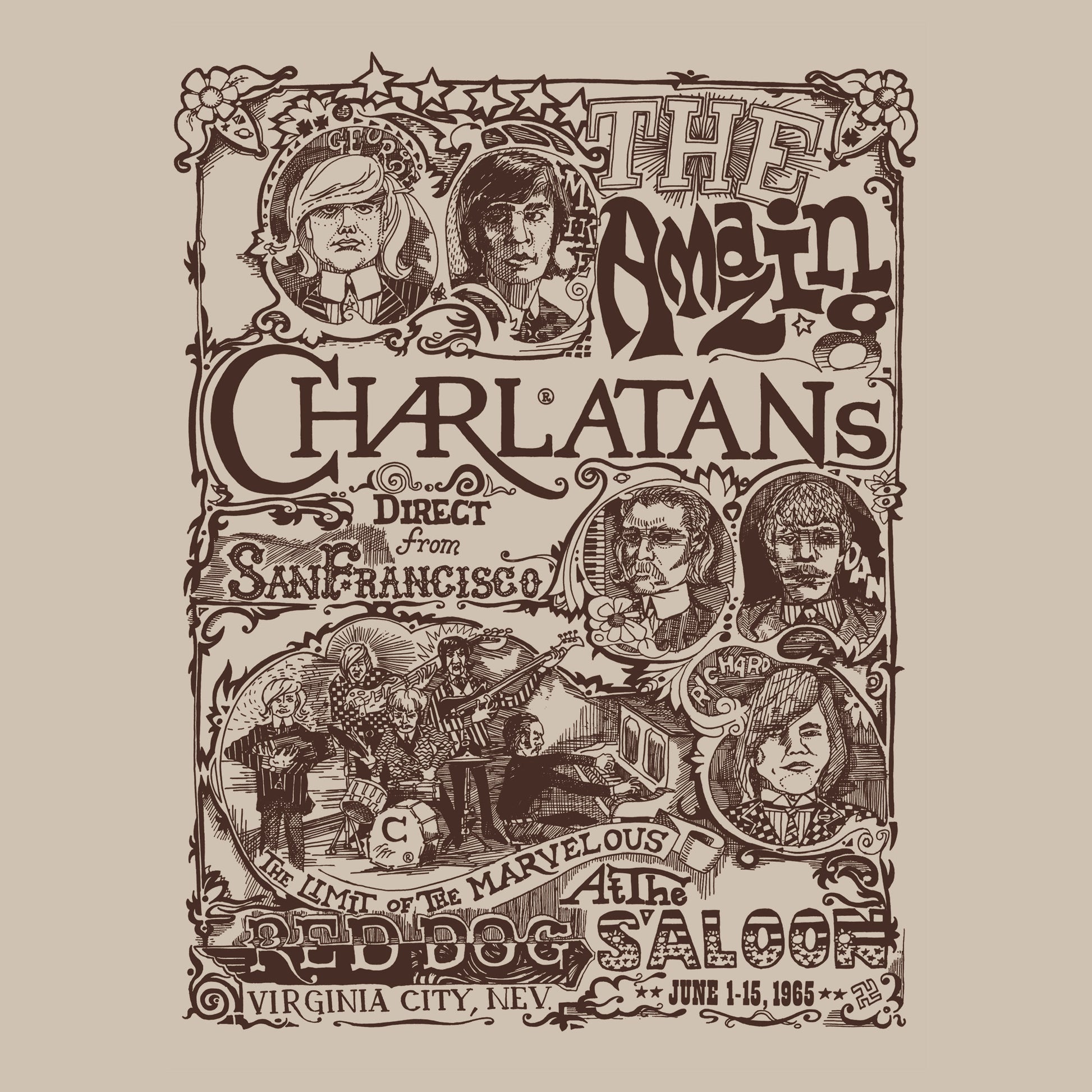 The Red Dog Saloon is (still open) a bar that played an important role in the birth and development of psychedelic music. Located in Virginia City, Nevada, it began to fill with bands experimenting with new methods, light shows, blending in with the audience... The Charlatans were the first band seen taking LSD on stage.